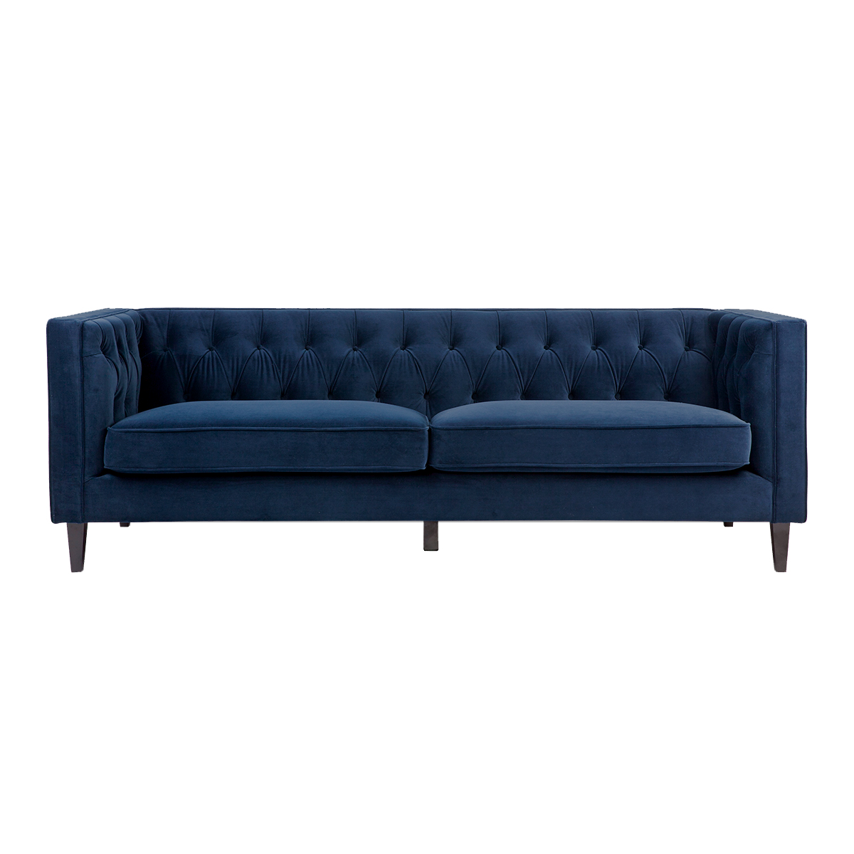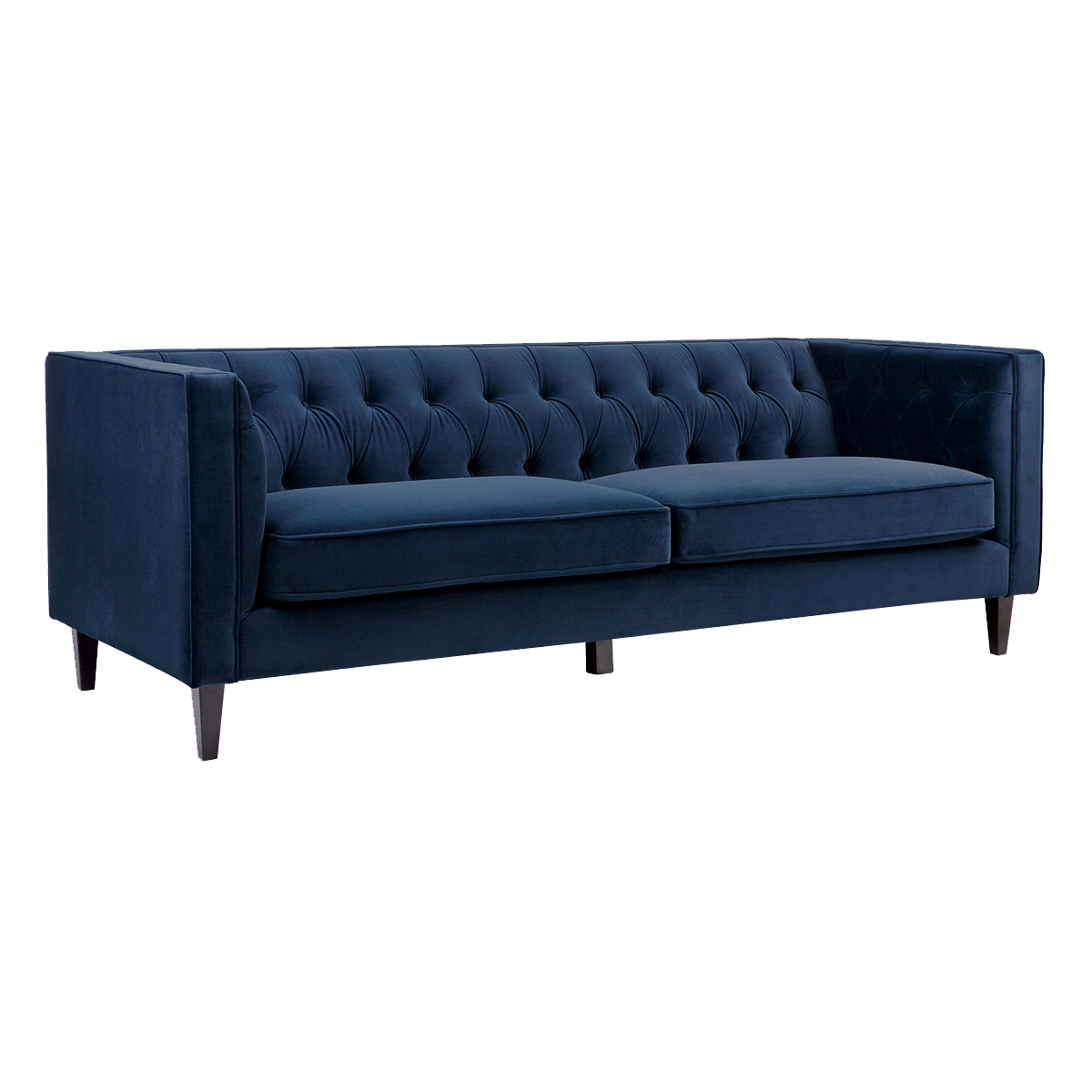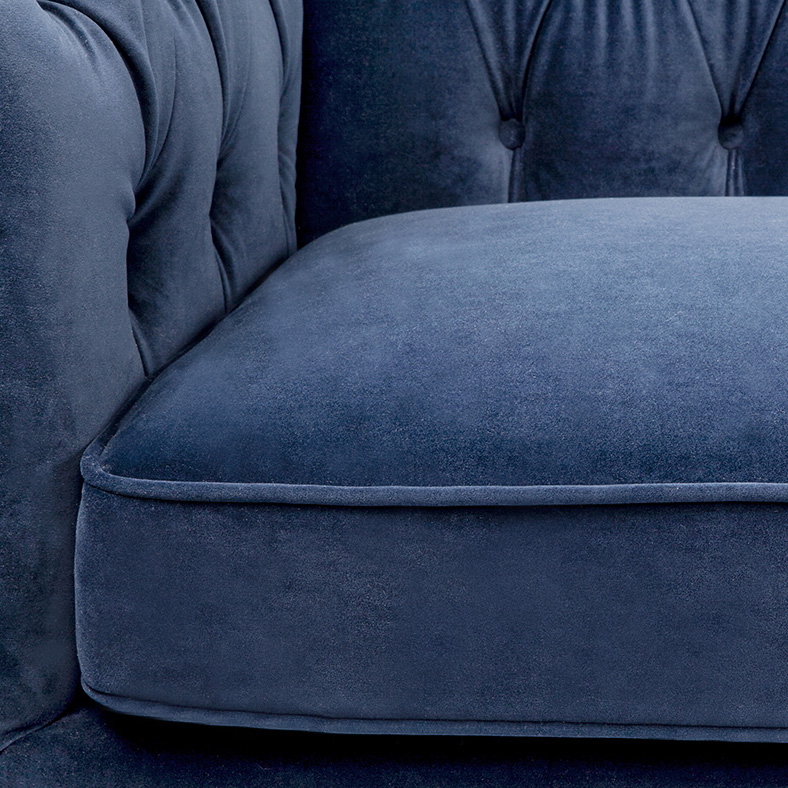 Exquisitely upholstered with a beautiful button-tufted backrest and detailed piping in a sumptuous navy velvet, the Anton 3 seater sofa flaunts divine design. Featuring a foam and dacron wrap cushion seat for maximum comfort, the clean modern lines and black timber legs work in charming contrast to the classically detailed velvet upholstery creating a timelessly sophisticated sofa that is the ultimate in classic contemporary design.