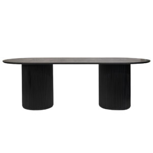 A sleek contemporary statement, the Arlington round dining table unites tactile organic surfaces with bold architectural form and modern finishes. Exquisitely crafted in satin black finished Ash wood veneer, the Arlo features a smooth round table top curving to a beautiful ribbed cylindrical base. Exuding an uncomplicated, urban energy, the simple lines of the Arlo infuse both traditional and modern spaces with striking sculptural style. Available in two sizes to comfortably seat 6 (1.5m)