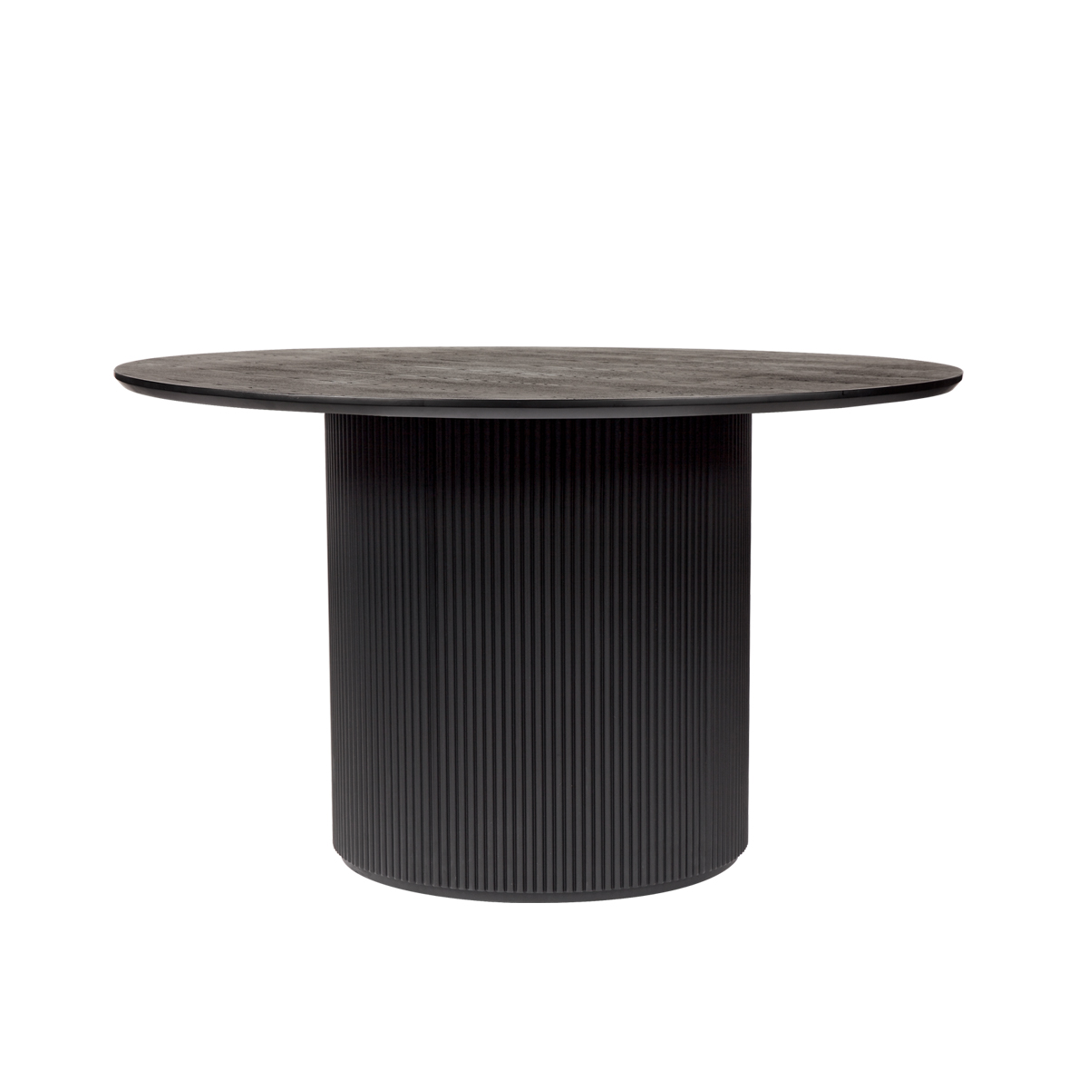 A sleek contemporary statement, the Arlo round dining table unites tactile organic surfaces with bold architectural form and modern finishes. Exquisitely crafted in satin black finished Ash wood veneer, the Arlo features a smooth round table top curving to a beautiful ribbed cylindrical base. Exuding an uncomplicated, urban energy, the simple lines of the Arlo infuse both traditional and modern spaces with striking sculptural style. Available in two sizes to comfortably seat 6 (1.5m) or 4 people (1.2m).