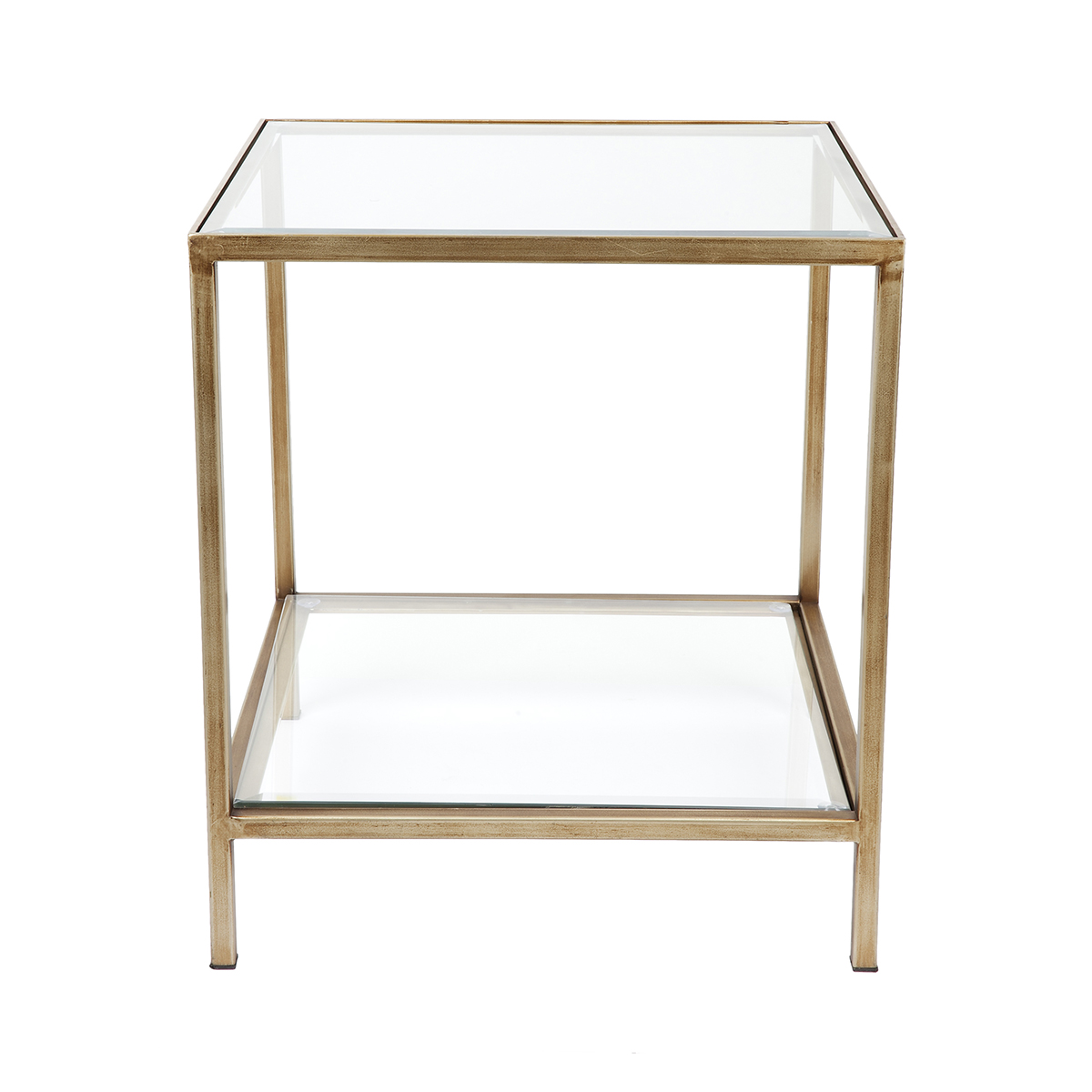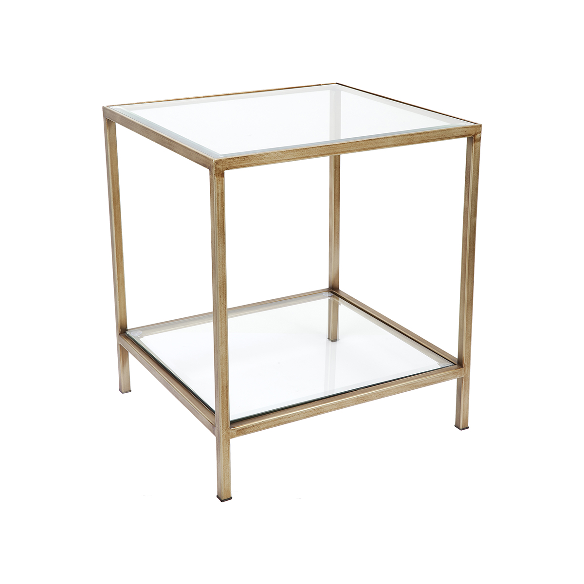 The Carter range is the perfect collection for adding a touch of class and function to your home with a slender and open design. Crafted with an iron frame in a myriad of finishes. The Carter square side table is an elegant piece for a refined home with delicate proportions finished in an antique gold hand painted finish, accented by inlaid bevelled-edge glass. Place a pair of these charming side tables on either side of the sofa, or bed for both beauty and practicality.