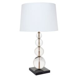 Cherished for its shapely stack of solid crystal glass spheres, detailed with a gold stem. The square black marble base brings such elegance to the Isabelle Table Lamp. It will add such fresh personality to your home. The Isabelle is topped with a white linen drum shade. A definite show piece in any room.